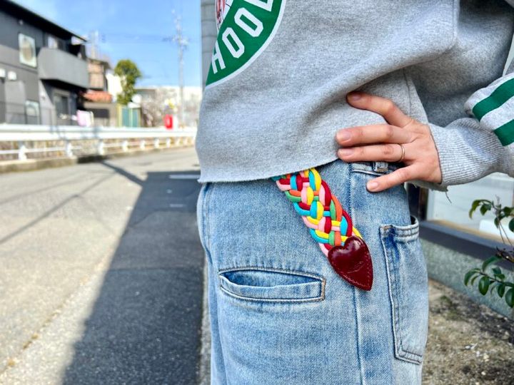 ポップなカラーが着こなしのポイントになっているメッシュベルトは「ヴィヴィアン・ウエストウッド」。「ヴィヴィアンのバッグや小物は、20代の頃からずっと長く愛用しています」。