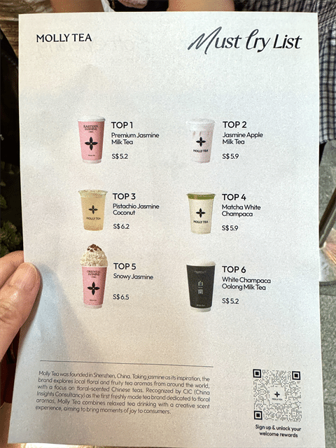 初めてなのでまずは人気No.1の「プレミアムジャスミンミルクティー」(5.2シンガポールドル・日本円で約648円)を注文することに。このとき店頭で配られていたチラシに書かれた「飲むべきドリンクリスト」には、2番目に「ジャスミンアップルミルクティー」(5.9シンガポールドル・日本円で約735円)、3番目に「ピスタチオジャスミンココナッツ」(6.2シンガポールドル・日本円で約773円)が挙げられていました。