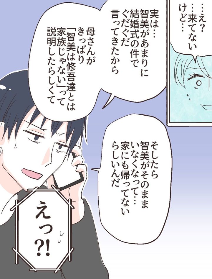 修吾の話によると、智美さんが私たちの結婚式についてあまりにもしつこく口出ししてきたため、義母がきっぱりと「智美さんは修吾たちの家族ではない」と伝えたそうです。その言葉にショックを受けたのか、智美さんはそのまま姿を消し、家にも戻っていないとのことでした。