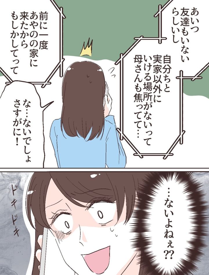 「あいつ友達もいないらしいし、自分ちと実家以外にいける場所がないって母さんも焦ってて・・・前に一度あやのの家に来たからもしかしてって」そう話す修吾に、私は即座に「な、ないでしょさすがに!」と返します。しかし、自分ではないと言い切ったものの、なんだか智美さんが来そうな予感もする。私は内心ドキドキしながら電話を切りました。