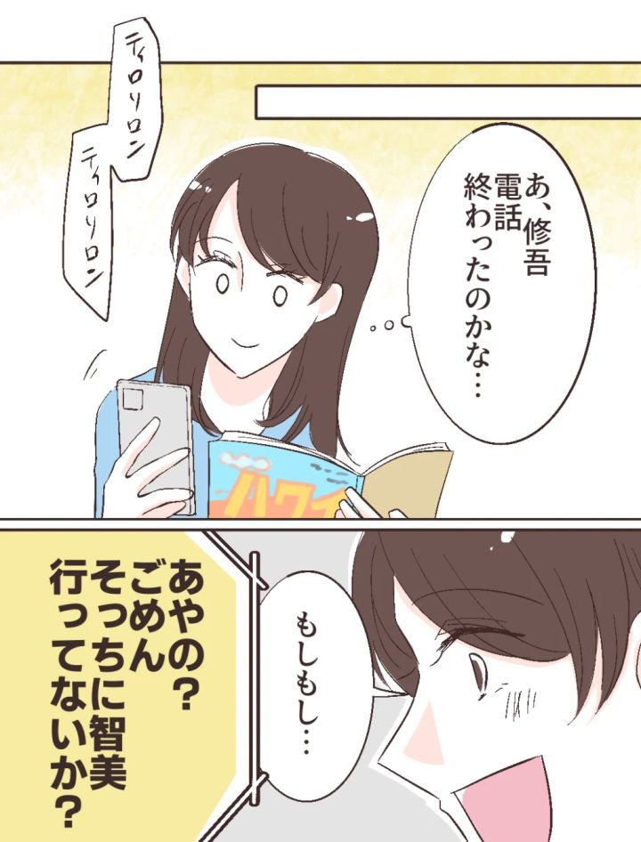 ハワイのガイドブックを読みながら待つこと数分、修吾から再び電話がかかってきました。「あ、電話が終わったのかな」と思いながら出ると、開口一番に「あやの?ごめん、そっちに智美行ってないか?」と、思いもよらないことを聞かれて驚いてしまいました。