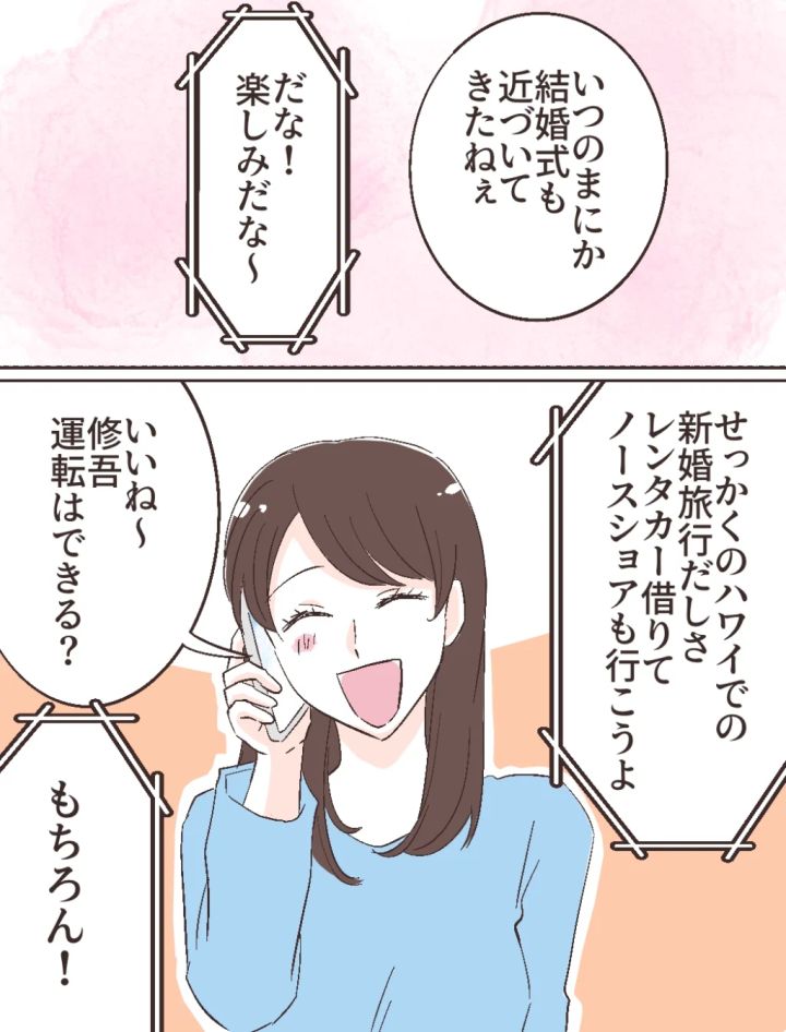そうこうしているうちに、結婚式まで残り2ヶ月となりました。この日は、結婚式と新婚旅行を兼ねた予定を詰めるため、電話であれこれ計画を練っていました。憧れのハワイで挙式を挙げて、そのまま新婚旅行を楽しめるなんて、今からワクワクが止まりません。