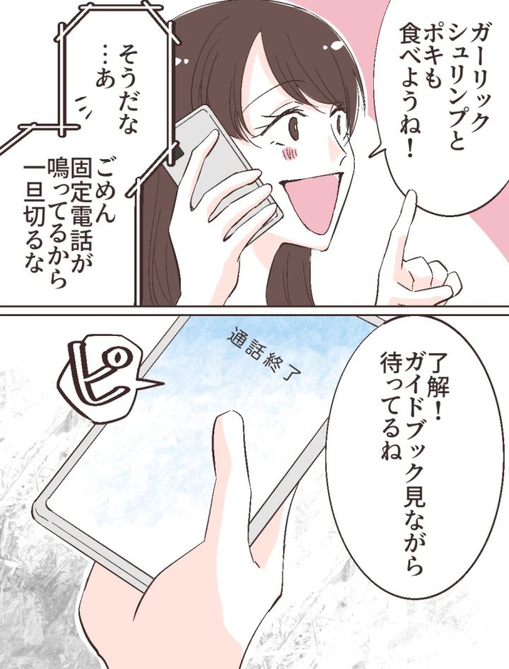 「ガーリックシュリンプとポキも食べようね!」なんて話していると、修吾が「そうだな・・・あ、ごめん固定電話が鳴ってるから一旦切るな」と言いました。私は「了解!ガイドブック見ながら待ってるね」と返し、そのまま電話を切りました。
