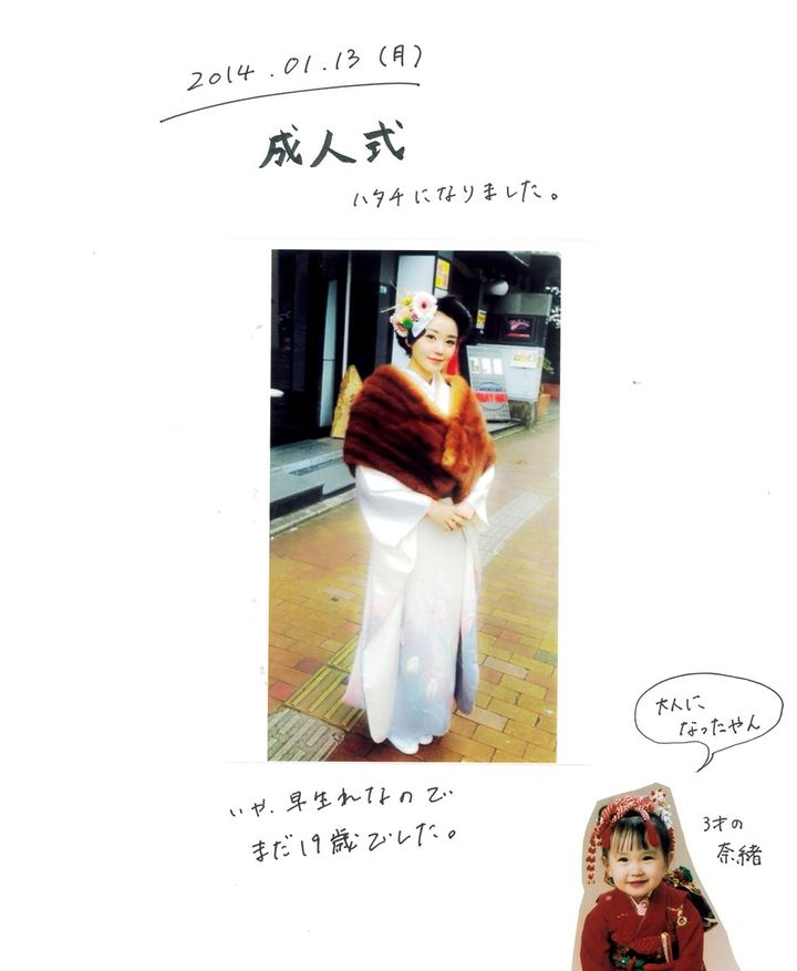 奈緒さんの手書き文字や写真とともに、子ども時代から現在までを時系列でたどるページも。写真はすべて奈緒さんが選んだもの。「プリントしたものを切り抜き、コラージュのように貼って構成しました」