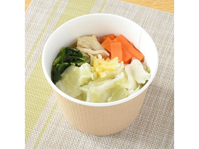 1/3日分の野菜を使用した旨塩スープです。鶏や魚介などの旨みがきいた味わいで、具材には蒸し鶏・キャベツ・もやしなどを使用しています。トッピングのゆずで風味をプラスしました。 ※宮崎県、鹿児島県では取り扱いがございません。