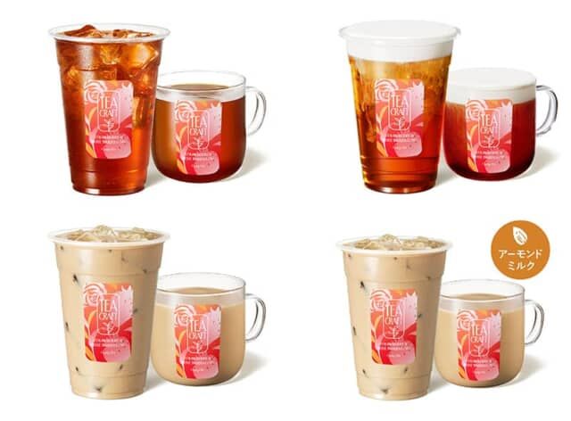 ▲左上から「ストロベリー&ローズ ダージリンティー」、「ストロベリー&ローズ ダージリン ミルフォティー」、「ストロベリー&ローズ ダージリン ミルクティー」、「ストロベリー&ローズ ダージリン アーモンドミルクティー」