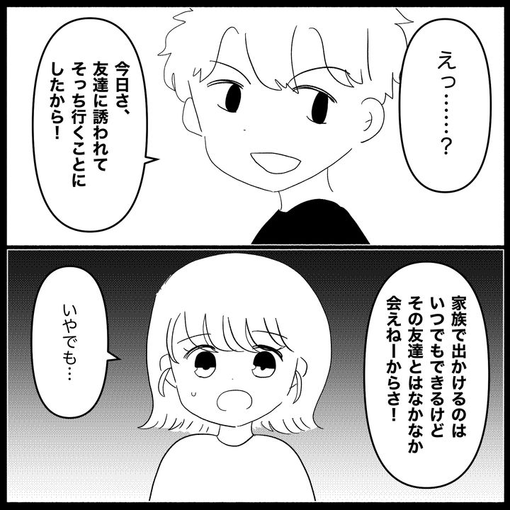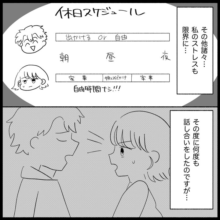 自分の都合を優先し、家庭のことはまったく顧みない夫・こうき。子どもが楽しみにしていたおでかけをドタキャンしても、まったく悪びれる様子がない。子どもが生まれて親になったのはあやかだけで、こうきは「父親」になりきれていないのだ。そのことにさえ気づいていない夫にストレスをためる日々が続くが、ついに我慢の限界を超え…。
