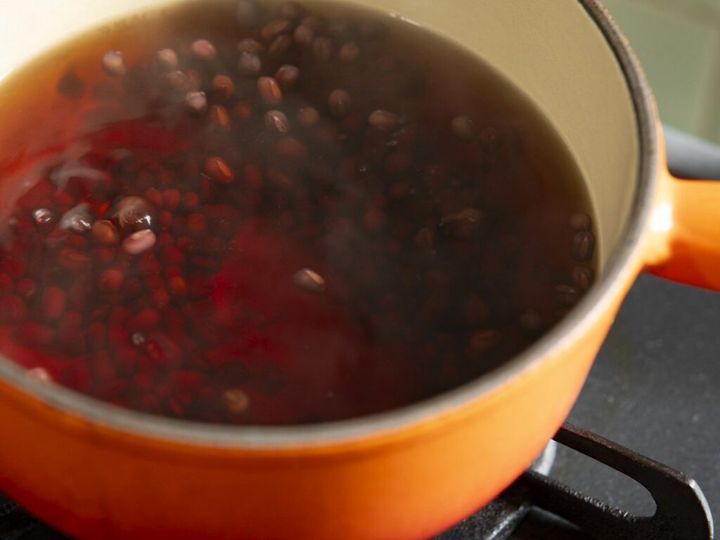 (3)鍋に(2)の小豆を入れ、水4カップを加えて強めの中火にかける。沸騰したら3分ほどゆで、アクが出てきたら取り除く。ふたをし、中火にして15分ほど、弱火にして10〜15分ゆでる。小豆を1粒食べてみて、少し堅い程度まで火が通ったら、火を止める。