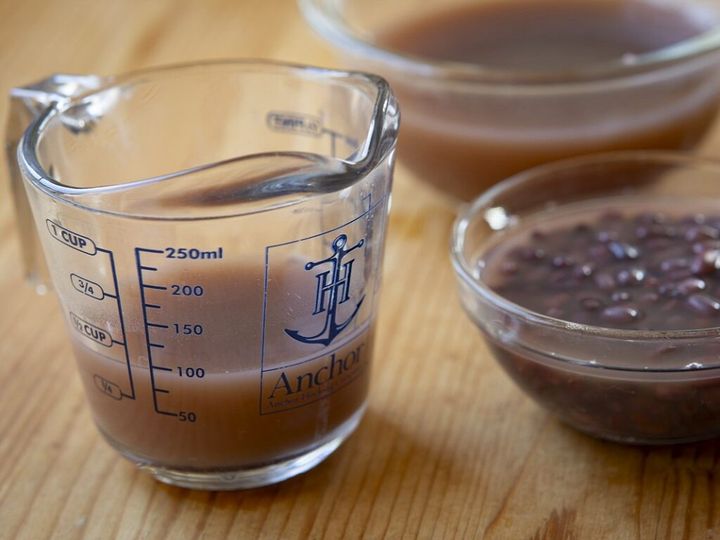 (4)小豆はボールに入れ、乾燥しないようにゆで汁適宜を注ぐ。残りのゆで汁のうち、1/2カップをとっておき、残りはもち米の色づけ用に別のボールに入れてさます。