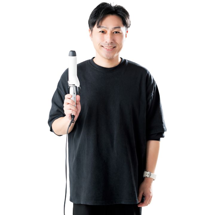 サイドをこめかみの高さで上下に分けます。38mmのカールアイロンで下を外巻き、上はアイロンを斜めに使って毛先が後ろに向かうように巻きます。後ろは毛先のみ外巻きに。前髪とサイドバングは毛先を軽く巻きます。