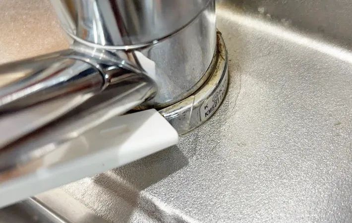 次に試したのが、シンクの水道の根元部分。ここはパッキンに沿って、黒ずみが溜まりやすい場所です。