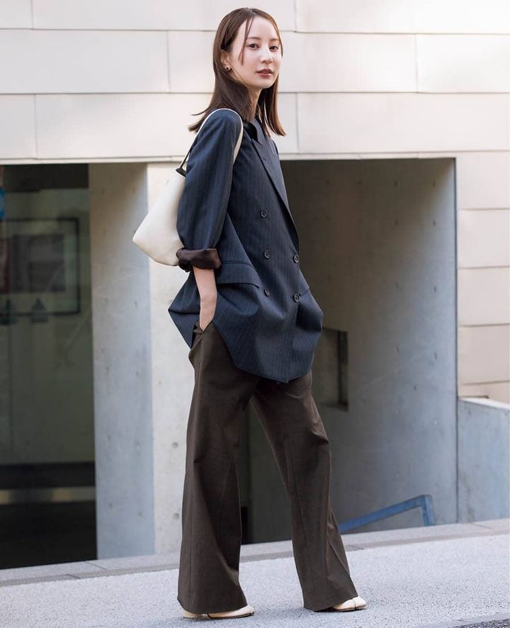 「メンズ仕立てのようなピンストライプのダブルジャケットが着たい気分。脚のラインがキレイに出るフレアパンツで女性らしさをプラスしてコーディネートが締まるようにしました。ホワイトのレザー小物でシックなトーンにヌケ感を」