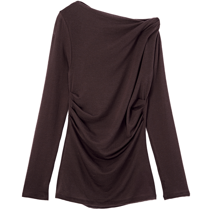 「胸元から裾までのアシンメトリーなドレープとカシミア混の柔らかな肌触りが◎」トップス¥18,700(ヴェニカ/Souple)