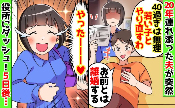 20年連れ添った夫「若い子と人生やり直すわ」突然の離婚届「やった♡」役所にダッシュ!5日後…?