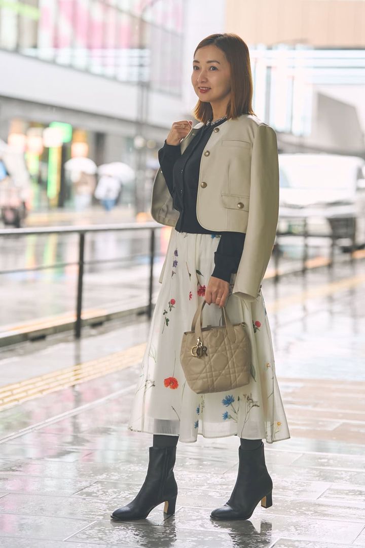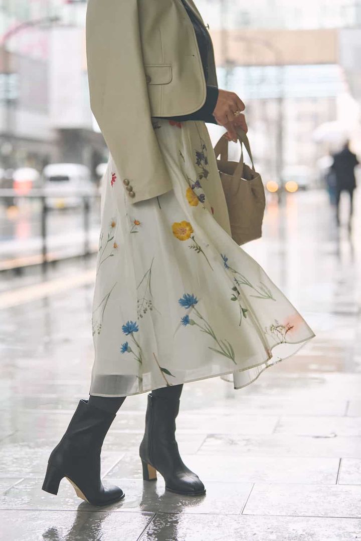「透け感のある軽やかな素材が重なった、春らしい花柄スカート。歩くたびに揺れるドラマティックなシルエットがお気に入りです。柄は大きすぎず小さすぎないサイズ感で、淡すぎない色合いを選んで子どもっぽく見えないように。スカートの華やかさを活かすため、トップスはブラックで引き締め、レザージャケットで甘さを程よく抑えました」
