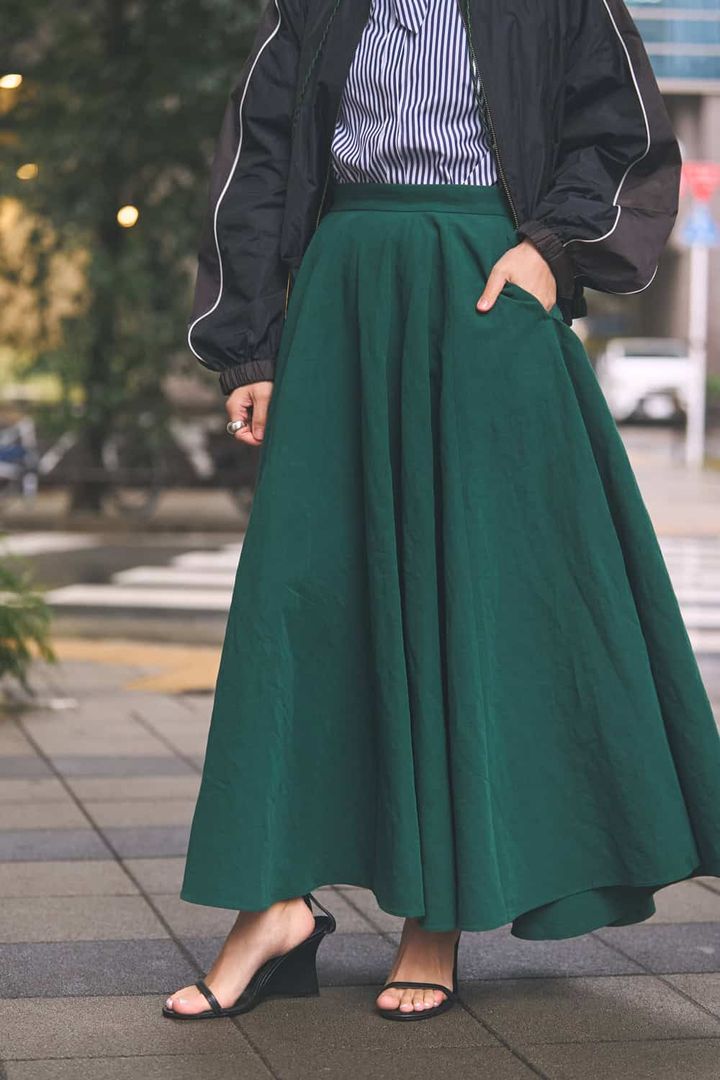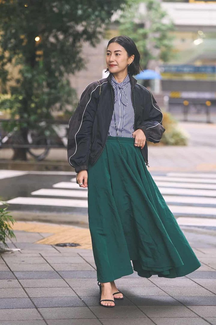 「たっぷりとしたフレアで存在感のあるスカートですが、リネンの風合いと落ち着いたグリーンカラーで甘さ控えめに着られる一枚。スポーティーなブルゾンにトラッドなストライプシャツを合わせて、大人のスポーティーMIXに仕上げました。足元は華奢サンダル、バッグはチェーンのミニバッグを選び、女性らしさをさりげなくプラス」