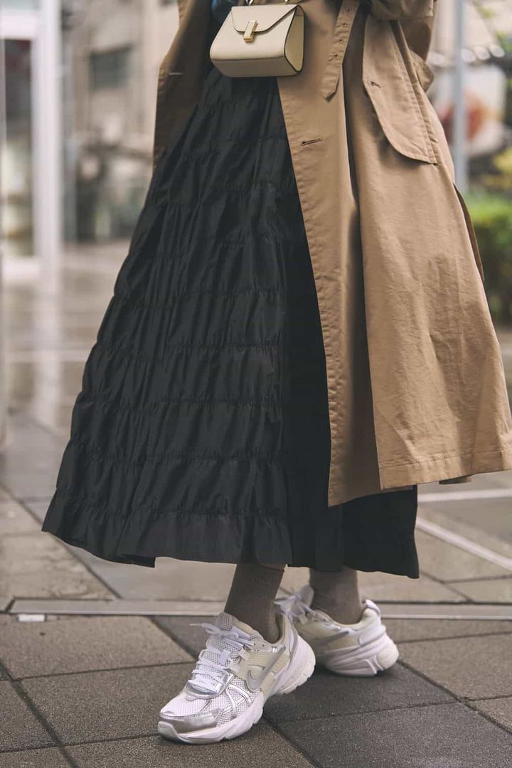 「何段にも重なったティアードに細かいギャザーが入り、立体的に広がるデザインが魅力のスカート。ブラックでもしっかり存在感があり、コーデの主役になる一枚です。きれいめに合わせるのも素敵ですが、今回はごつめのスニーカーとデニムシャツを合わせてカジュアルな雰囲気に。合わせ方次第で違った表情が楽しめるところもお気に入りです」