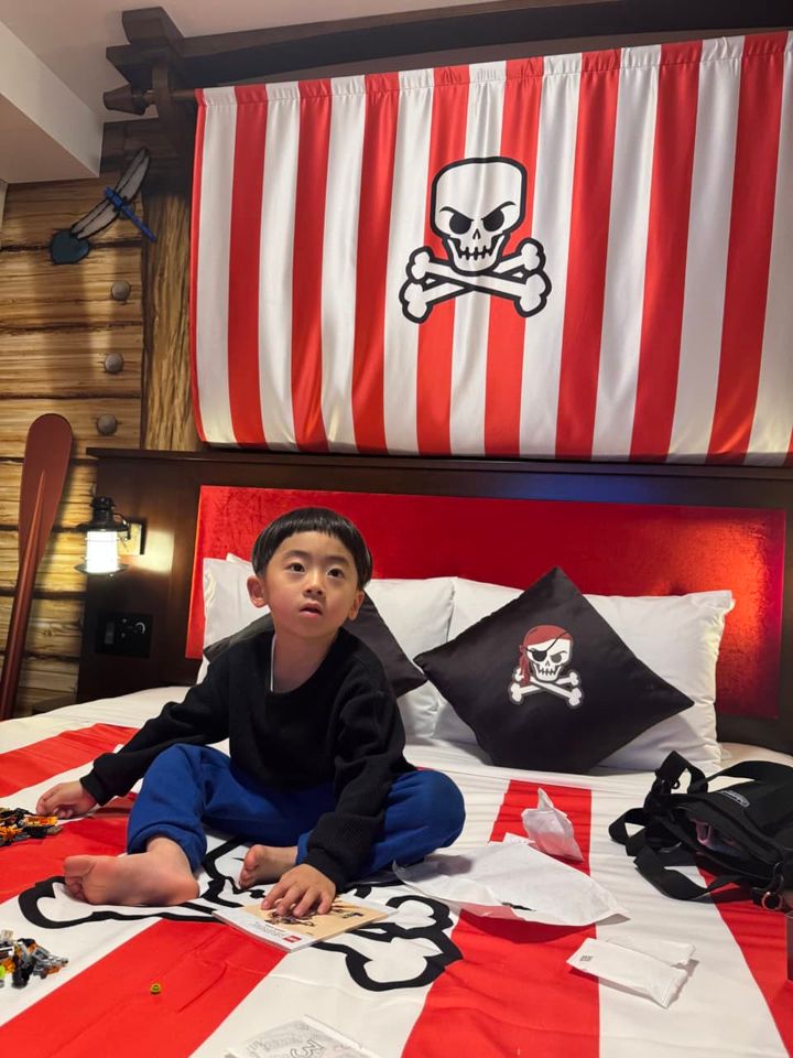 土曜日の朝8時前に品川から新幹線に乗り、名古屋の金城ふ頭にある「レゴランド・ジャパン」に11時前にパークイン。閉園の18時まで遊び倒して、電池切れの息子(母も)と「レゴランド・ジャパン ホテル」へ。嗚呼、目の前でよかった……! チェックインも済ませていたので、カードキーを受け取り、すぐさまお部屋へ向かいました。お部屋は海賊をモチーフにした「パイレーツ」。プレミアムクラスのお部屋で、メインルームにはクイーンサイズのベッド、入口すぐの子どもスペースには二段ベットも。息子は「今日はここの上で寝る!」と大喜び。お部屋の楽しい雰囲気に眠気も吹っ飛び、ひと通り探検をして、気が付くと、ゲットしたレゴを出して、早速遊んでいました。