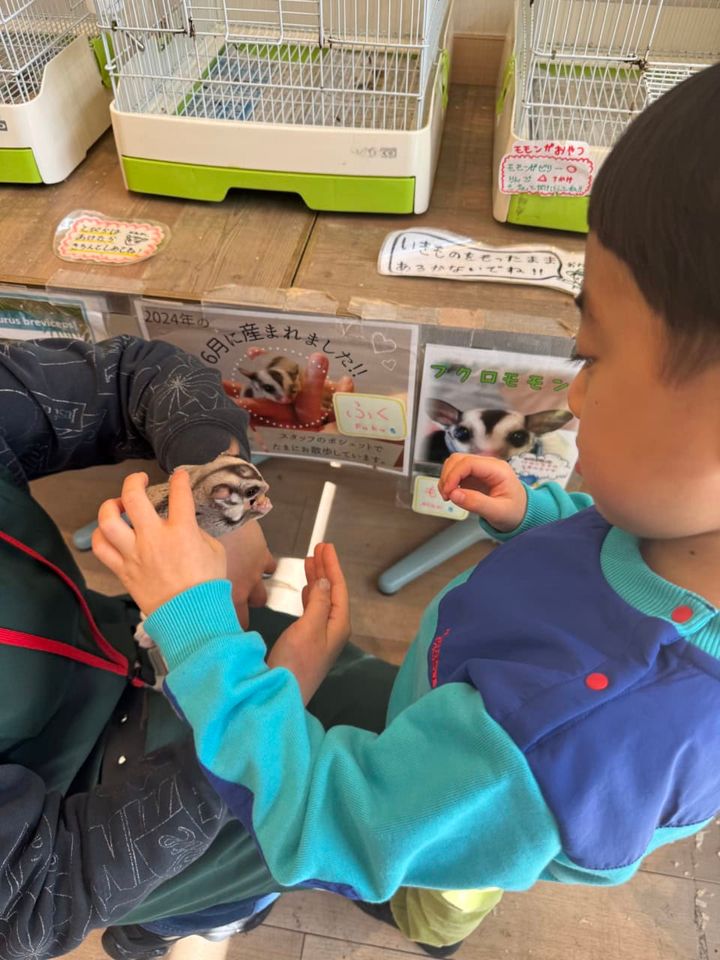 これがまた、想像以上に楽しめて、結果的に大正解! 30種類以上いる生き物に自由に触れることができ、餌やり体験もできました。うさぎやモルモットにはこれまでも何度か触れ合う機会があったのですが、インコやモモンガは初体験! 飼育員さんやまわりにいる人たちと楽しそうにおしゃべりしながら、触れ合っていました(コミュ力高い)。こちらが声をかけなければ、ずっとでもいそうな雰囲気でした。