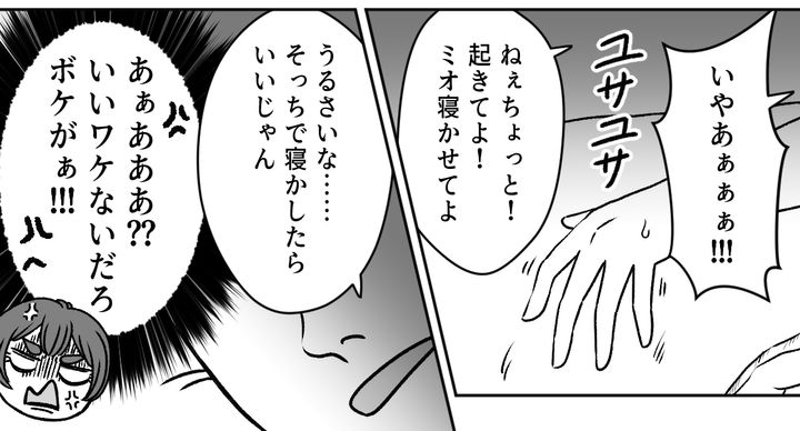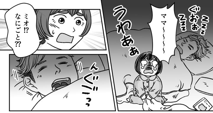 旦那は一日中寝たあと飲みに出かけたのに、ミオを寝かしつけるどころか自分が先に寝てしまいました。