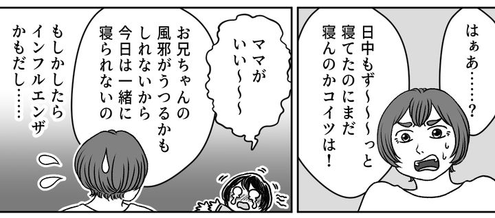 私はセイカ(30代前半)。旦那のジュンジ(30代前半)が一日中寝て過ごしている中、私はひとりで家事をして4歳のタケと1歳のミオを公園に連れて行き、買い物を済ませて帰りました。すると「今から飲みに行く」と旦那が出かけたのです。イラっとはしましたが反対はせず送り出すと、夜にタケが発熱。高熱だったので旦那に「帰ってきてほしい」と伝えたのです。旦那は渋り「お前が今度行く結婚式や飲み会は覚えていろ」と捨て台詞を吐きました。イヤイヤ帰ってきた旦那はミオを寝かしつけたはずなのに、部屋からミオの泣き声がするのです。