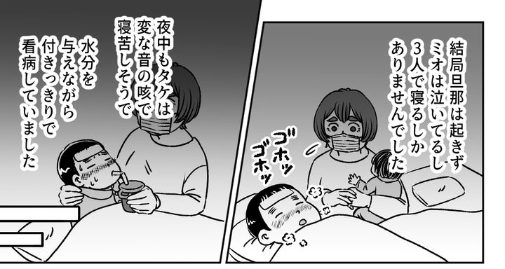 結局旦那は起きず、ミオは泣いているし、3人で寝るしかありませんでした。夜中もタケは変な音の咳をしているので、水分を与えながら、私は心配で眠れませんでした。