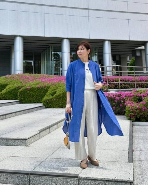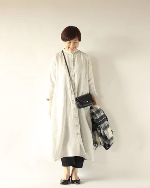 「ラクな服がいいけどカジュアルすぎるのはちょっと……」、その場合はゆったりめのシャツワンピースを選んでみて。リラクシーな着心地でもクリーンな雰囲気があるので、50代の旅行コーデにぴったりマッチします。ラグジュアリーなホテルや高級旅館でも気後れせずに過ごせますよ。