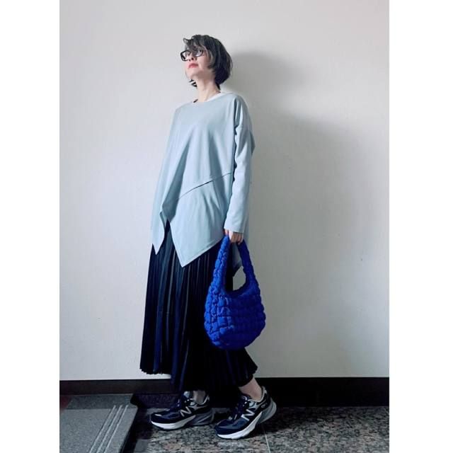 スナップのようなアシンメトリーデザインの長袖Tシャツも50代にぴったり。カジュアルなTシャツの着心地とスタイリッシュな印象を両立できます。