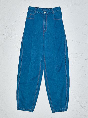 丸みのあるフォルムで脚線をカバーしつつ、大きなパッチポケットと、すその垂直なステッチで横幅の膨張感はセーブ。どこから見てもすらりとした脚に。+シャギーニットで爽快なブルーにぬくもりを。前面も計算されたワンタック&センタープレスをほどこしたデザイン。