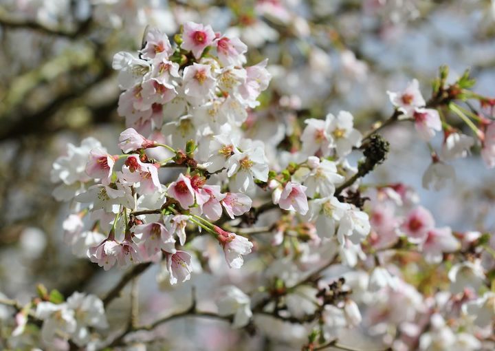 カンヒザクラとマメザクラ(フジザクラ)の交配種で早咲きの桜の1つ。一重の5弁花をうつむき加減に咲かせます。大きくならないので家庭の庭で楽しみやすい品種です。