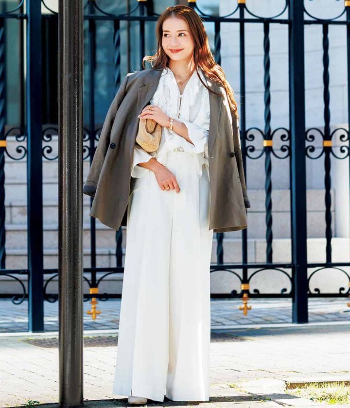 『ホテルランチの日はジャケットを羽織って落ち着いた雰囲気にまとめます。フリルが甘く見えないよう、ボトムスはワイドパンツで少しモード感をプラス。』