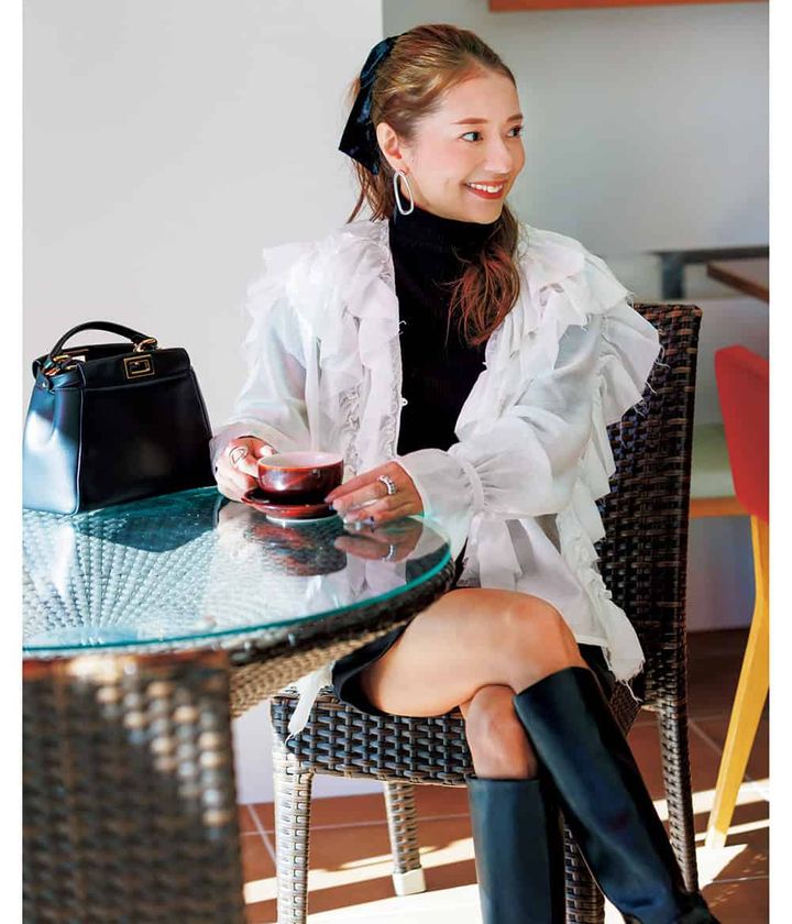『ブラウスはフリルが重なったような袖のデザインとスタイルアップが叶う短か丈がお気に入り。黒なのでモードかつ、華やかに盛れるところがポイント。』