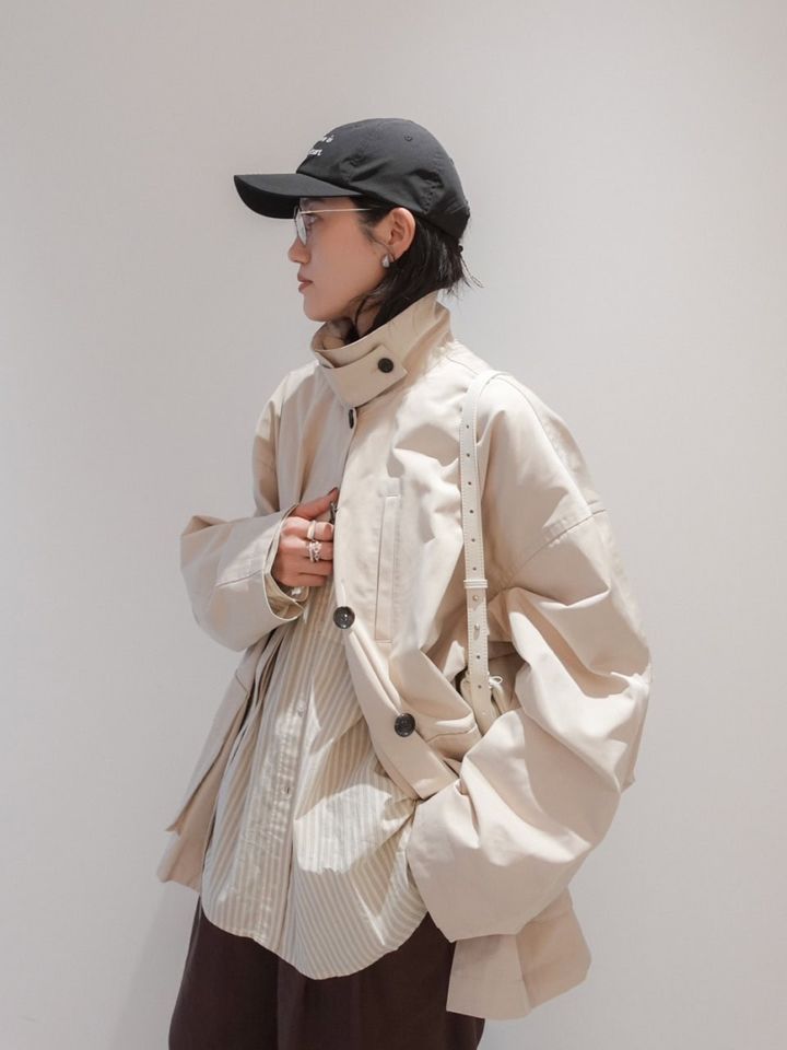 「このアウターはフォルム感のあるオーバーシルエットと大きめポケットがポイント。襟を立てて着られるところや、ワークムードのあるデザインながら、ハリとほどよい艶のあるツイル素材なので、カジュアル過ぎずモードな着こなしになるところがお気に入りです」アウター¥18,700(ànuke)