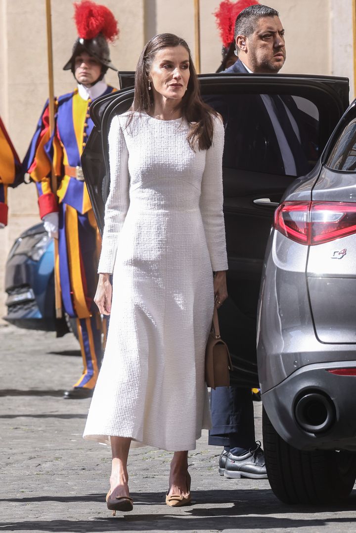 現地時間3月20日(金)、フェリペ6世国王と共にバチカンを訪問した王妃。昨年5月にローマ教皇に選ばれたレオ14世教皇と謁見した。通常、ローマ教皇と会うときには黒いドレスとベールを着用するのがルール。しかしカトリックを信仰する王室&公室のレディだけは「白の特権」を持ち、白いドレスとベールを着けることが許される。スペイン王室もカトリックを信仰しているので、王妃も全身白のドレスで現れた。今回は公務ではなく、プライベートでの謁見だったからかベールは着けていなかった。