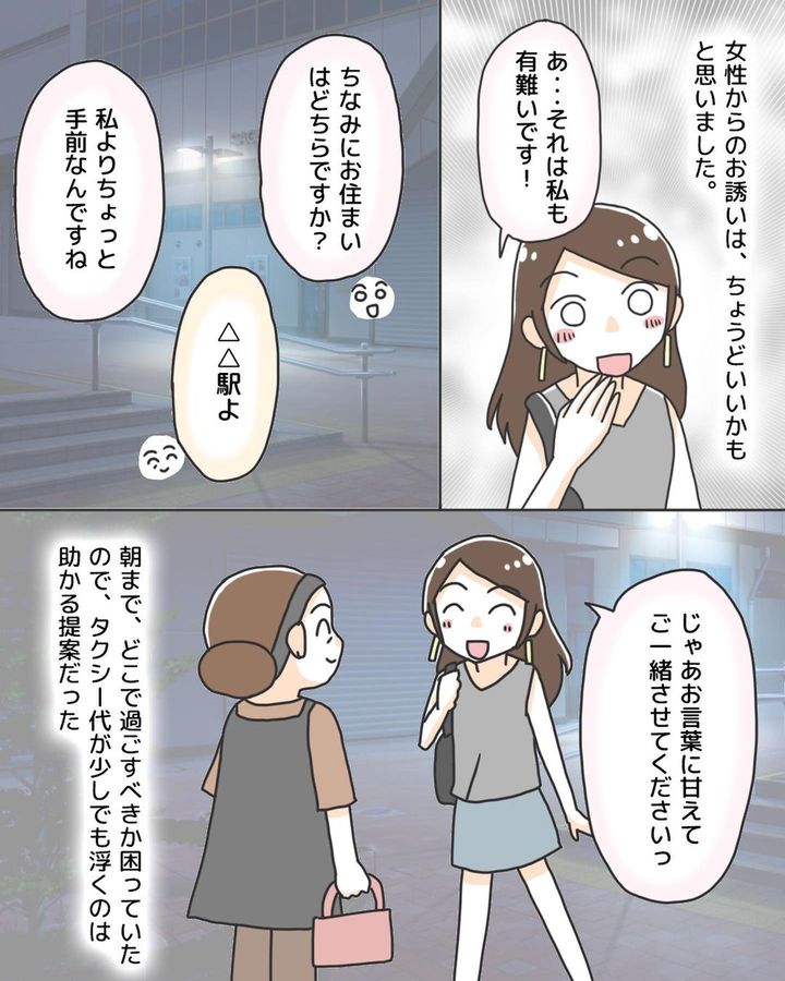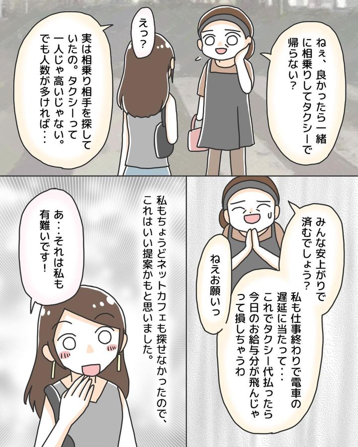 終電を逃して困っていたところ、中年女性からタクシーの相乗りを持ちかけられた。相手が女性だったため誘いに応じたが、車内には女性が先に声をかけていた若い男性の姿があった。最初は好印象だったその男性は、女性が先に降りて2人きりになった途端に態度を豹変させ…。あと少しで危なかった恐怖の出来事。みなさんも気を付けて!