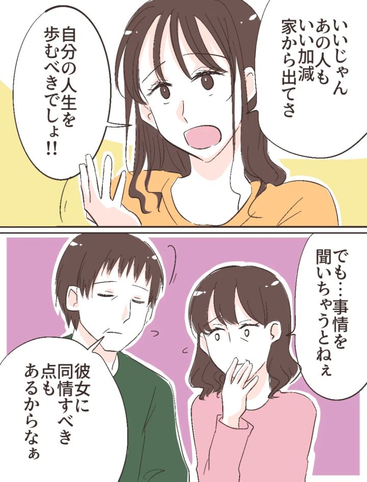 すると、「いいじゃん。あの人もいい加減家から出てさ、自分の人生を歩むべきでしょ!!」ふみのがそう言うと、「でも・・事情を聞いちゃうとねぇ」「彼女に同情すべき点もあるからなぁ」と両親が親身になって言いました。