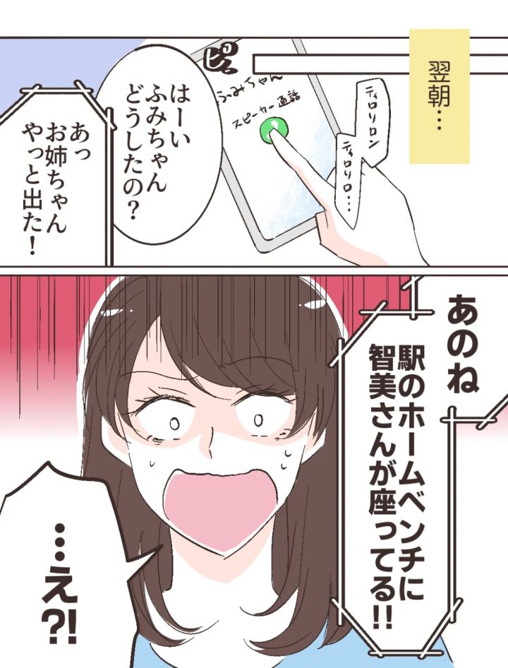 ふみのからの電話に気づき「はーい、ふみちゃんどうしたの?」と、電話に出ると「あっ、お姉ちゃんやっと出た!あのね、駅のホームのベンチに智美さんが座ってる!!」ふみののその言葉に、私は「・・え!?」と驚きました。