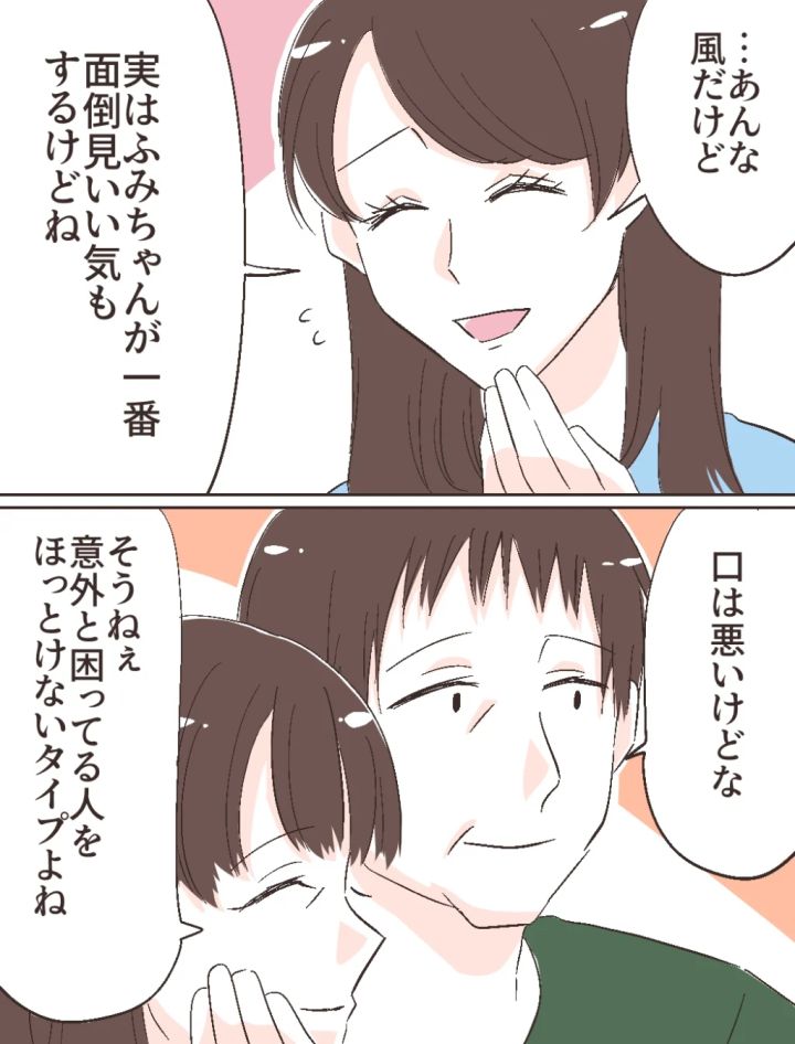 「・・あんな風だけど、実はふみちゃんが一番面倒見いい気もするけどね」私がそう言うと、「口は悪いけどな」とお父さん。「そうねぇ。意外と困ってる人をほっとけないタイプよね」とお母さん。ふみののことを家族はちゃんと理解していたのでした。