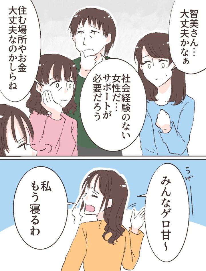 「智美さん・・大丈夫かなぁ」私がそう言うと、「社会経験のない女性だ・・サポートが必要だろう」というお父さんの言葉に、「住む場所やお金大丈夫なのかしらね」とお母さん。その言葉を聞いたふみのは、「うげー、みんなゲロ甘~。私もう寝るわ」と呆れて部屋へ行ってしまいました。