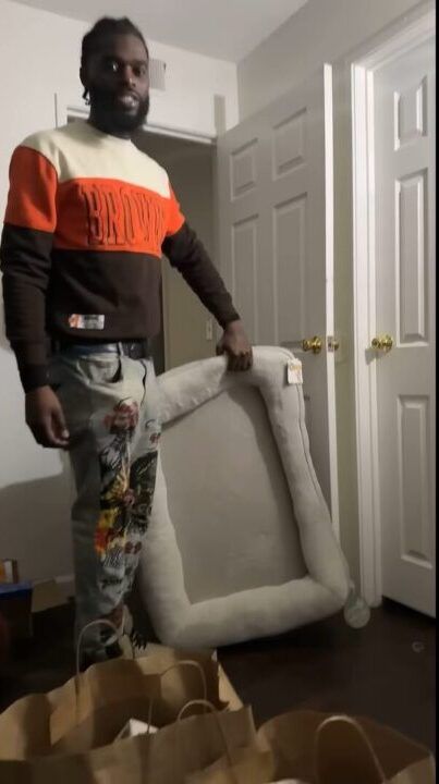 男性が手にしているのは、愛犬のために購入してきた新しいベッド。 足元にはいくつかの買い物袋が並んでいるようですが、その中でも飛びぬけて大きな一品です。