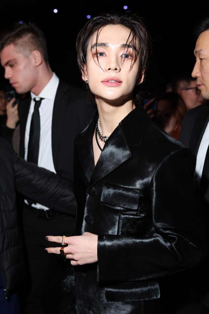 パリで開催された「ディオール」のショー会場でヒョンジンをキャッチ! サングラスでラフにかき上げたオールバックヘアに、スモーキーなアイメイクを効かせ、ワイルドな印象に。