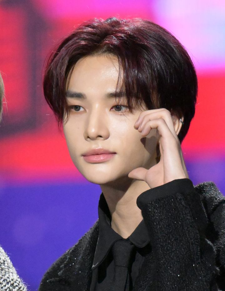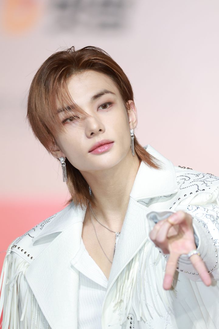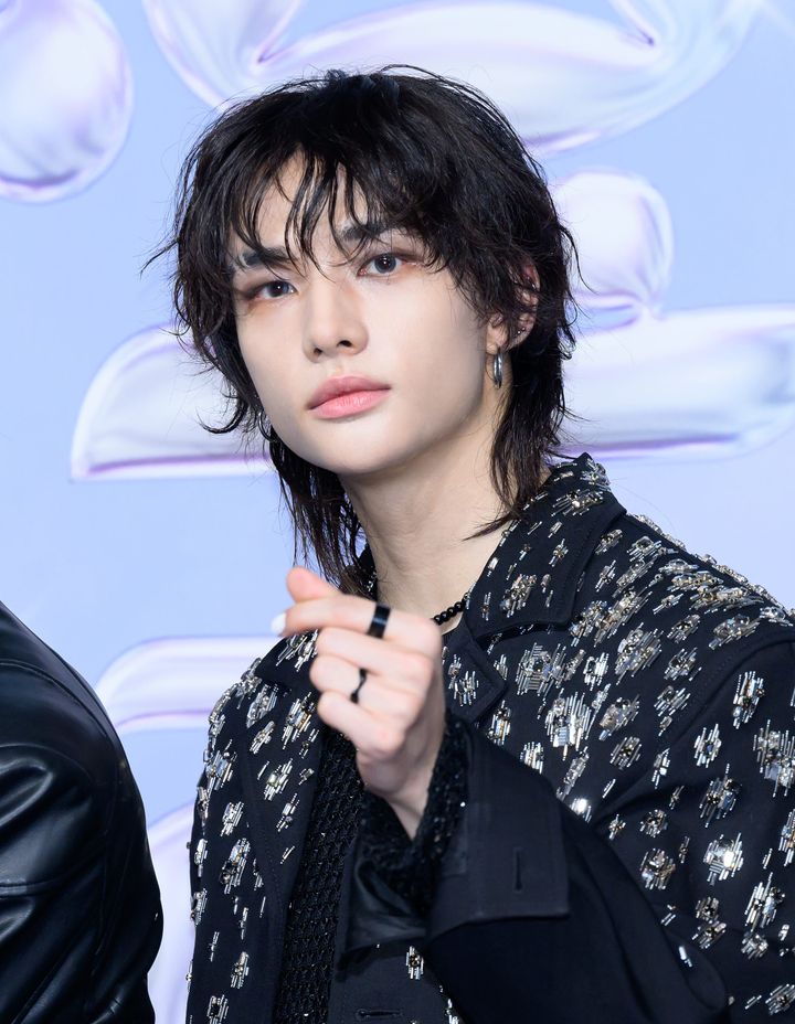 「2024 SBS Music Awards Summer」にて。前に下ろした無造作パーマヘアに、クールな低温メイクを施したアンニュイなヘアメイクが、ヒョンジンの儚さを最大限に引き出して。
