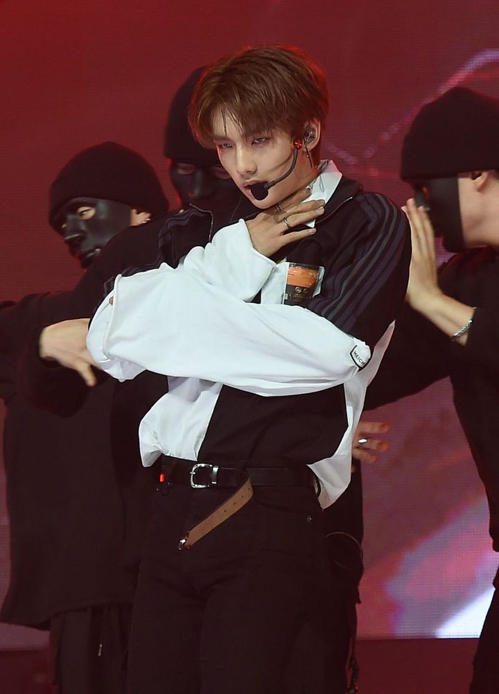 『2020 THE FACT MUSIC AWARDS』に登場したスキズ。リップラインをシェーディングカラーで囲み、影をつけて、ぷっくり唇を演出するのがヒョンジン流。