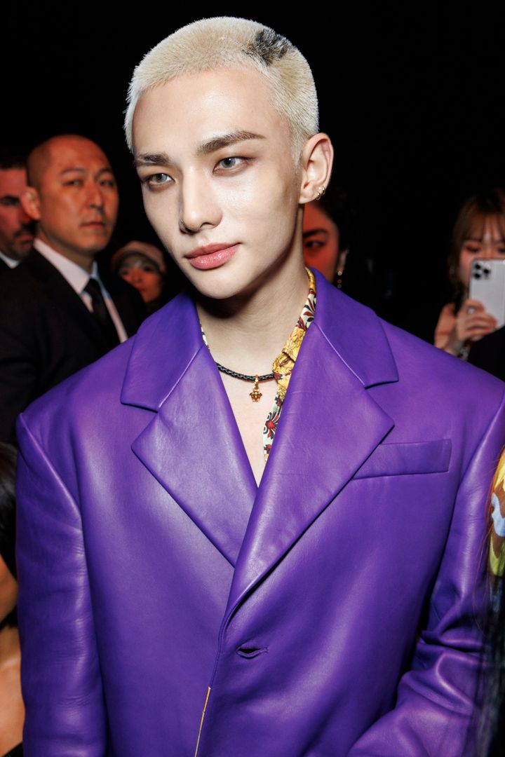 「ヴェルサーチェ」のコレクションに出席するためミラノを訪問。儚さ漂う繊細なピンクメイクと、対極のオールバックヘア&眉ピアスを組み合わせたヒョンジン。人々を惹きつける危険な魅力を放って。
