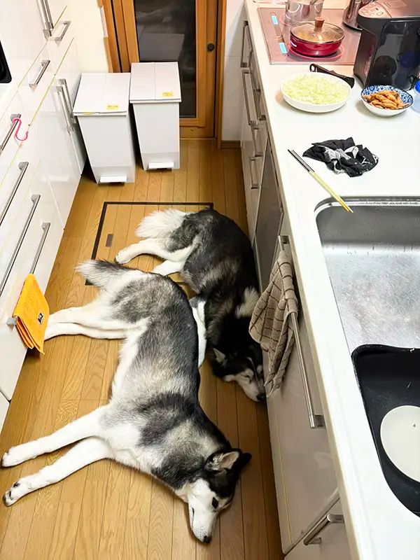 キッチンにやって来た飼い主 ハスキーの行動に「100点のフォーメーション」「我が家も毎晩これ」の声