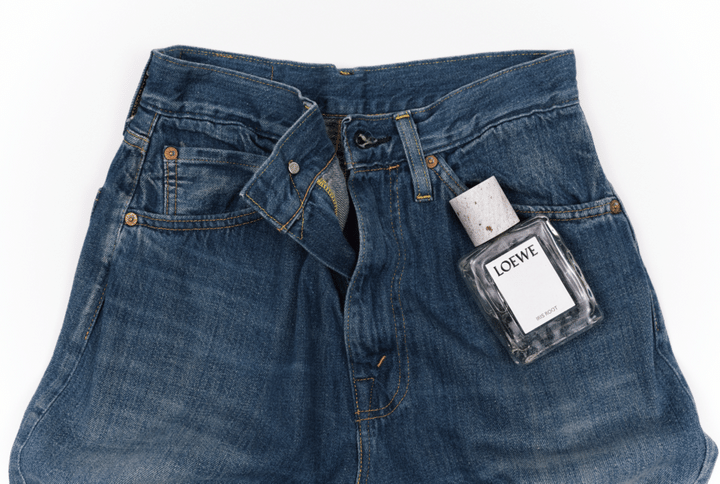 アイリスの根茎とハーバルなアンジェリカシード、シトラスノートからなるコンポジション。オードゥ パルファン“ロエベ アイリス ルート” 100mL ¥64,900(ロエベ パルファム)デニム¥16,500(リーバイス®/リーバイス・ストラウス ジャパン)