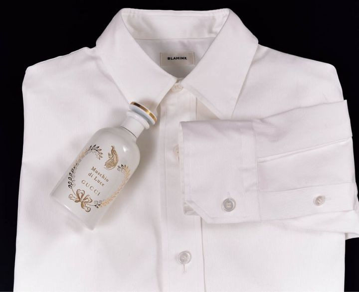 ムスクにトレンドのピンクペッパーを組み合わせ、爽やかにしてモダンな印象に。グッチ ビューティ グッチ ムスキオ ディ ルーチェ オードパルファム 100mL ¥50,050(コティジャパン・2月11日発売)、シャツ¥77,000(ブラミンク/ブラミンク トーキョー)