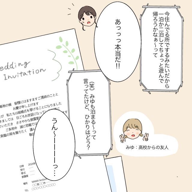 「今住んでる所でするみたいだから、1泊か2泊してちょっと遊んで帰ろうかなぁ~って」ゆきの言葉に、私は招待状に記載された式場の住所を改めて確認しました。確かに、うちからはとても日帰りはできそうにありません。するとゆきが「みゆも泊まるって言ってたけど、ひかりはどう?」と聞いてきました。
