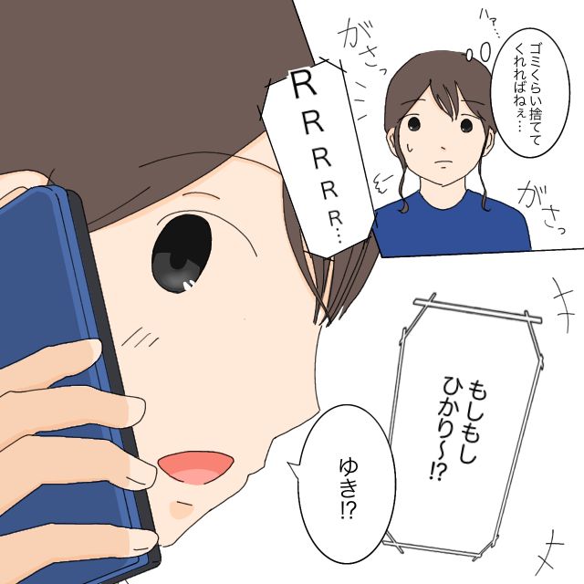 しかも、ゴミまで置きっぱなし。ゴミはゴミ箱に捨てるものだと、どうして分からないのでしょうか。ゆうたでさえ自分でゴミ箱に捨ててくれるのに・・・。頭の中で愚痴をこぼしながら片付けていると、友人のゆきから電話がかかってきました。