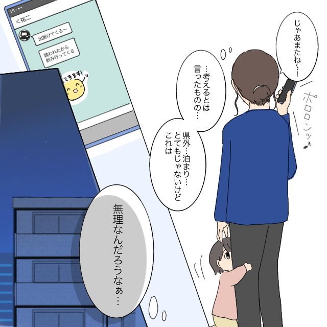 考えるとは言ったものの、県外で泊まりとなると、やっぱり現実的ではありません。きっと無理なんだろうなと、半ば諦めた気持ちになりました。通話を終えてスマホを見ると、裕二から「誘われたから飲みに行ってくる」というメッセージが届いていました。